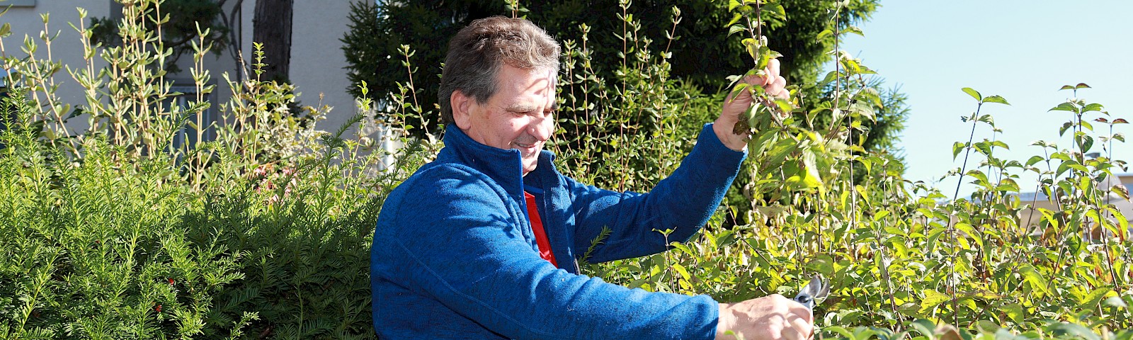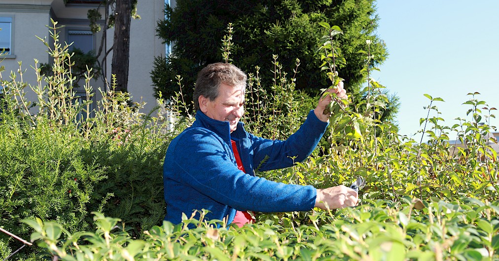 Nach der Znünipause geht’s abwechslungsreich weiter. Dann packe ich dort mit an, wo es gerade nötig ist. Während den Sommermonaten habe ich zum Beispiel sämtliche Balkone der Bewohnerzimmer mit dem Hochdruckreiniger gesäubert. Wenn jemand innerhalb unseres Alterszentrums umzieht, helfe ich beim Zügeln. Seit kurzem mache ich auch Pikettdienst, d.h. wenn nachts oder am Wochenende irgendetwas im Haus Tabea defekt ist, werde ich gerufen. Meine ersten «Notfälle» waren die kaputte Geschirrspülmaschine in der Küche und eine Ameisenstrasse quer durch ein Bewohnerzimmer. Beides habe ich erfolgreich bewältigt. Besonders oft arbeite ich im grossflächigen Aussenareal, das zum Haus Tabea gehört. Dort geht die Arbeit nie aus – je nach Jahreszeit wässern, jäten, Laub zusammenrechen, Sträucher schneiden und im Winter die Gehwege und Terrassen vom Schnee befreien. Da unser Areal auf mehreren Seiten an öffentliche Strassen und Fusswege grenzt, müssen dort die Hecken besonders häufig zurückgeschnitten werden. Mich trifft man bei jedem Wetter draussen an. Ich war früher in einem Bauunternehmen tätig und bin es gewohnt, bei Hitze, Regen und Kälte draussen zu sein.